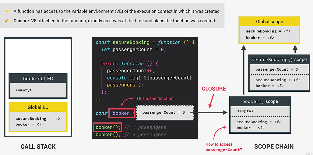 Basicamente un closure es la conexion que existe entre una funcion y el variable environment que existia cuando fue asignada. Este tiene prioridad sobre cualquier otro notes/Scope.
